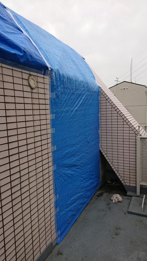 コーキングを打ち直すまでの一時的な間、ブルーシートで養生してきました。